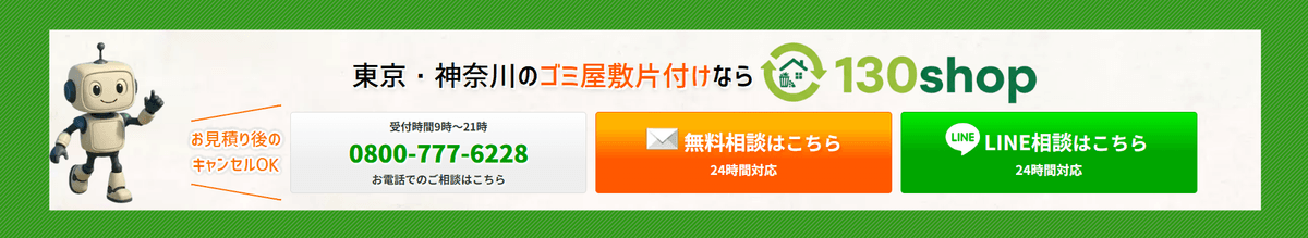 私たち130shopは、ゴミ屋敷・汚部屋の片付けを専門とし、お客様の「新しい生活への一歩」を全力でサポートすることを理念としています。どんな状況でも諦めず、長年の経験とノウハウを持つプロフェッショナル集団が、お客様の心に寄り添い、プライバシーと秘密厳守を徹底しながら、大量の不用品の効率的な仕分け・搬出から、高度な清掃・消臭までを一貫して請け負い、最短での問題解決と生活環境の劇的な再生を目指しますので、まずはお気軽にお問い合わせください。